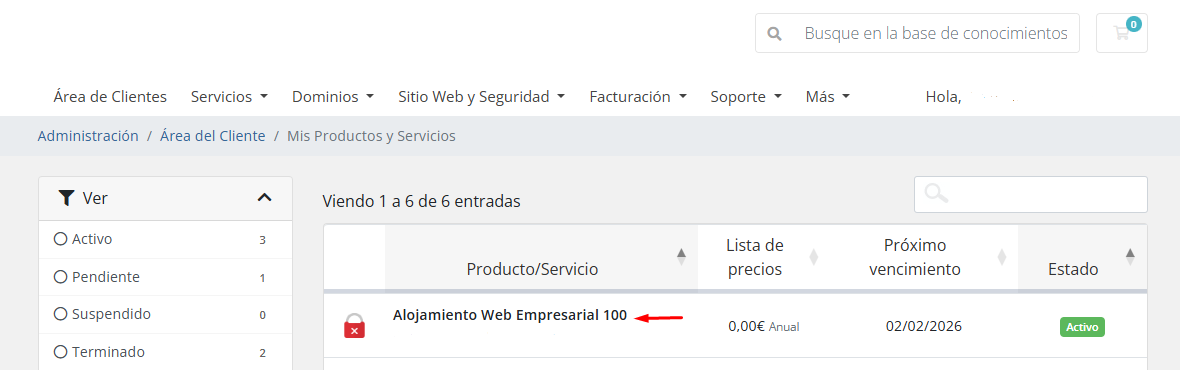 Ya una vez hayas ingresado al area de clientes vas a servicios-mis servicios-Alojamiento web o directamente ingresas en el item de Alojamiento web seguido en la opcion administrar