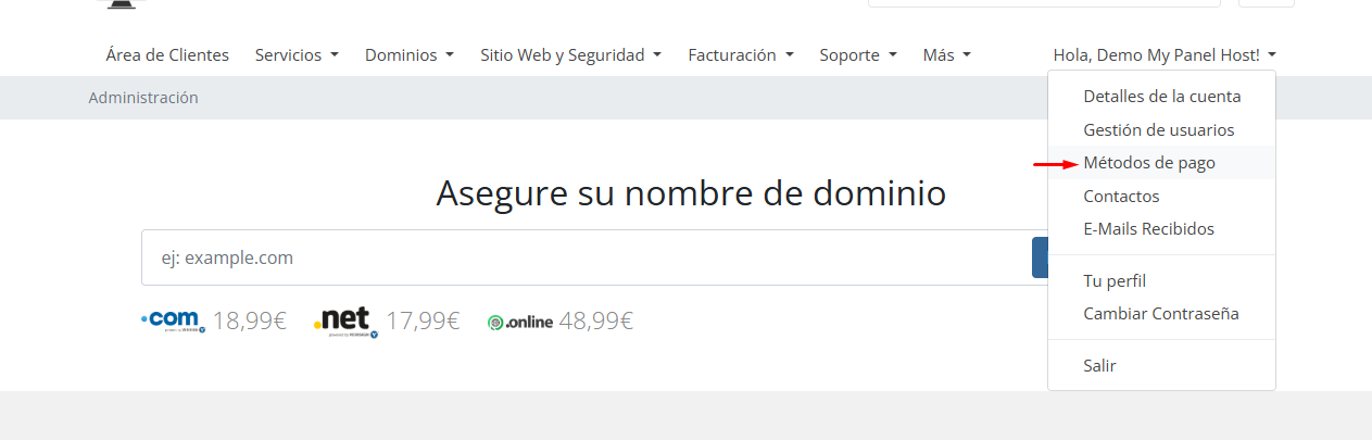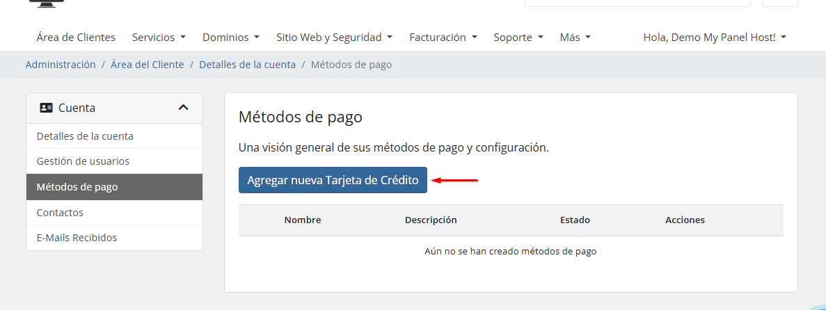 - Accede al botón superior derecho y haga click en Métodos de Pago